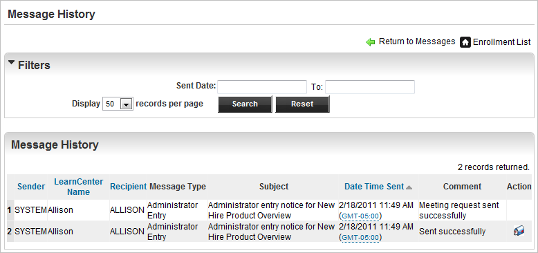 You can view the history of messages sent for the Enrollment or User for a particular message type. On the ControlPanel: